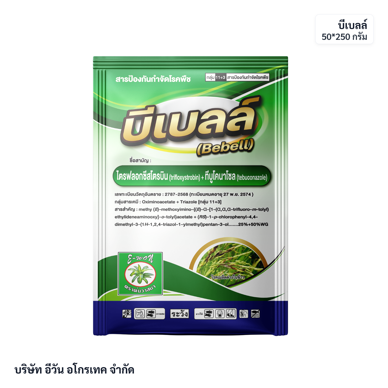 ประโยชน์ : ป้องกันกำจัดโรคใบจุดสีน้ำตาล โรคใบไหม้ โรคเมล็ดด่าง โรคเน่าคอรวง